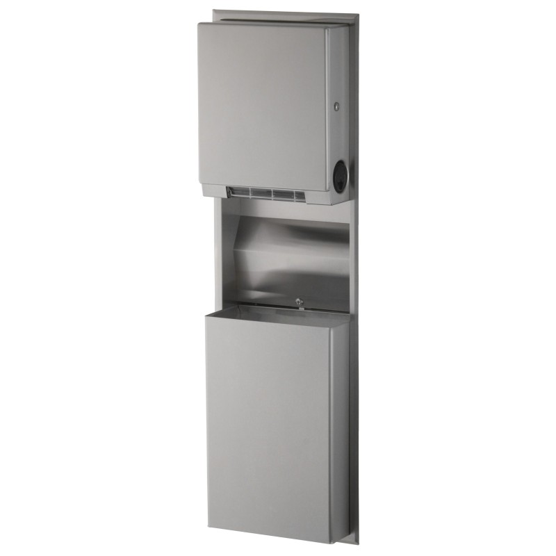 Convertible recessed stainless steel unit with large capacity, consisting of a paper towel dispenser and a waste bin (interchangeable modules).