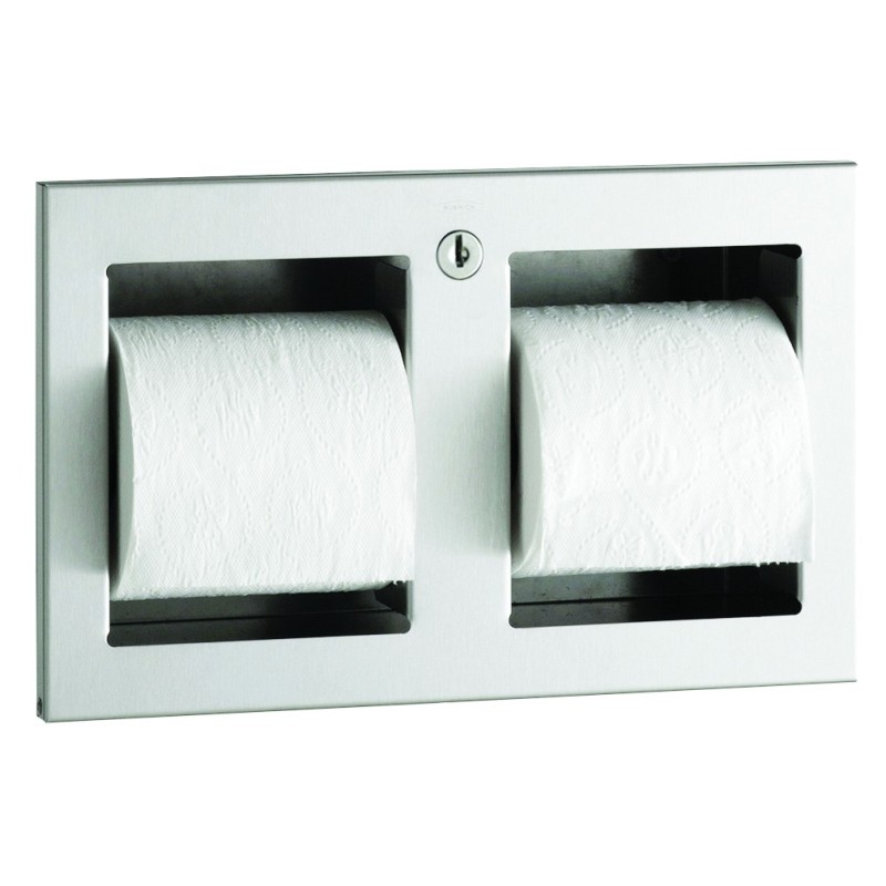 Double recessed toilet paper roll dispenser in stainless steel entirely welded.