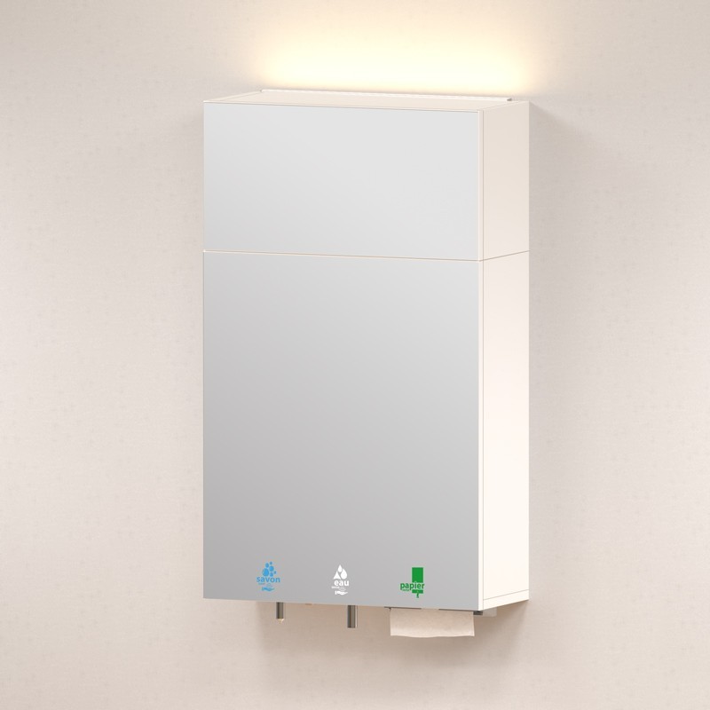 The HYFLO multifunction mirror cabinet is a practical all-in-one solution featuring an automatic liquid or foam soap dispenser, an electronic faucet with thermostatic premixer, and a touch-free high-speed hand dryer for a complete hand wash and dry, all in silence !