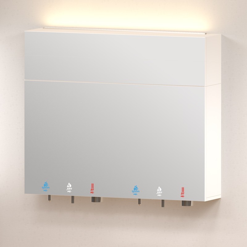 Double unit mirror cabinets, ready to be installed above a sink including liquid or foam soap dispensers, electronic water faucets with thermostatic pre-mixers, and concealed high-speed hand dryers. These functions are activated by touch free detection. LED pictograms.