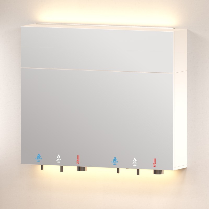 Double unit mirror cabinets, ready to be installed above a sink including liquid or foam soap dispensers, electronic water faucets with thermostatic pre-mixers, and concealed high-speed hand dryers. These functions are activated by touch free detection. LED pictograms.