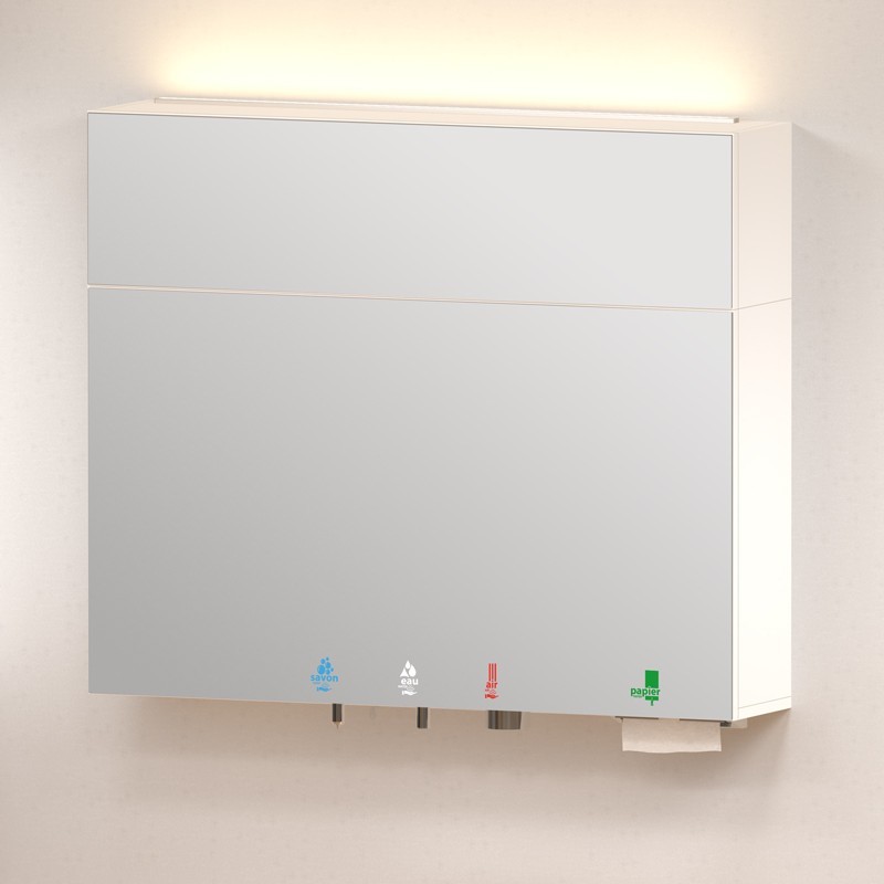HYFLO munltifunction mirror cabinet to mount above a sink including an automatic soap dispenser, liquid or foam, electronic water tap with a thermostatic pre-mixer, high speed hand dryer, sheet-by-sheet paper towel dispenser, and mirror with illuminated pictograms.