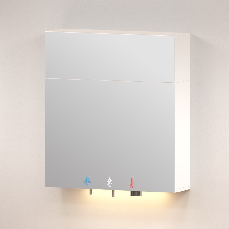HYFLO mirror cabinet to mount above a sink including an automatic soap dispenser, liquid or foam, electronic water tap with a thermostatic pre-mixer and the high speed hand dryer.