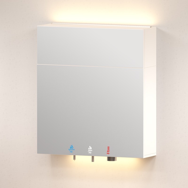 HYFLO mirror cabinet to mount above a sink including an automatic soap dispenser, liquid or foam, electronic water tap with a thermostatic pre-mixer and the high speed hand dryer.