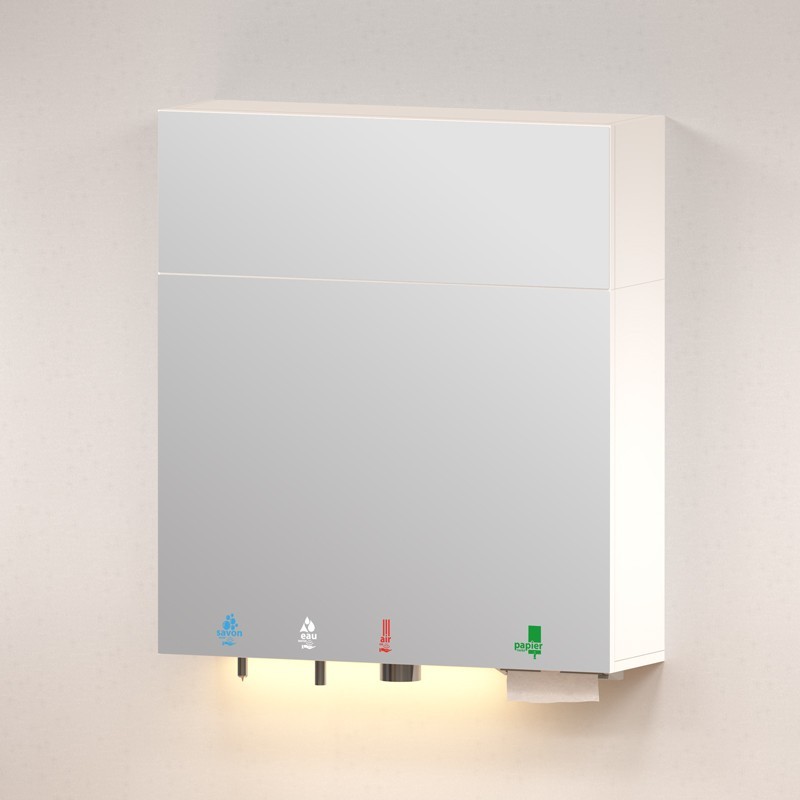 HYFLO munltifunction mirror cabinet to mount above a sink including an automatic soap dispenser, liquid or foam, electronic water tap with a thermostatic pre-mixer, high speed hand dryer, sheet-by-sheet paper towel dispenser, and mirror with illuminated pictograms.