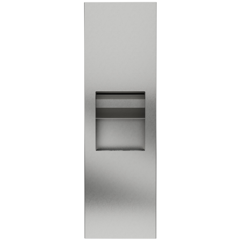 Recessed stainless steel combination with paper towel dispenser and 10L bin, for a complete, aesthetic and space-saving solution.