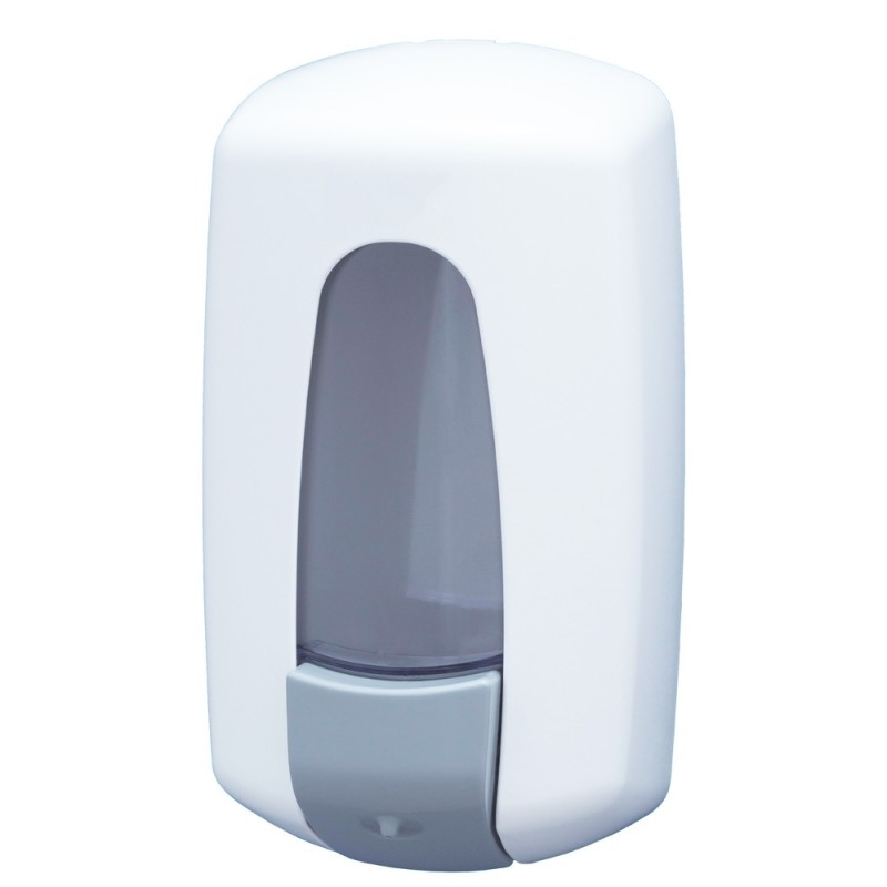 Dispensador de jabón mural con amplio pulsador flexible, compatible con jabón líquido, solución o gel hidroalcohólico.