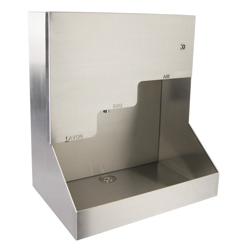 Lavabo de pared en calidad AISI 304 de 2 mm de espesor que combina lo esencial para el lavado de manos: jabón, agua y secado.