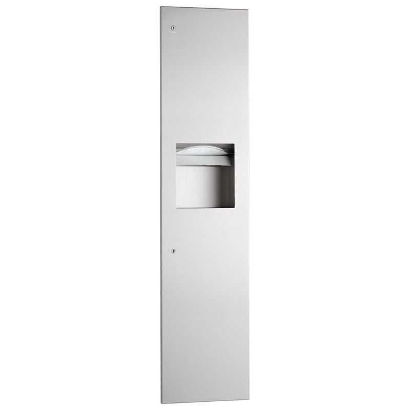 Combiné mural encastré inox SLIM distributeur de papier essuie-mains et poubelle intégrée, avec profondeur d’encastrement 92 mm.