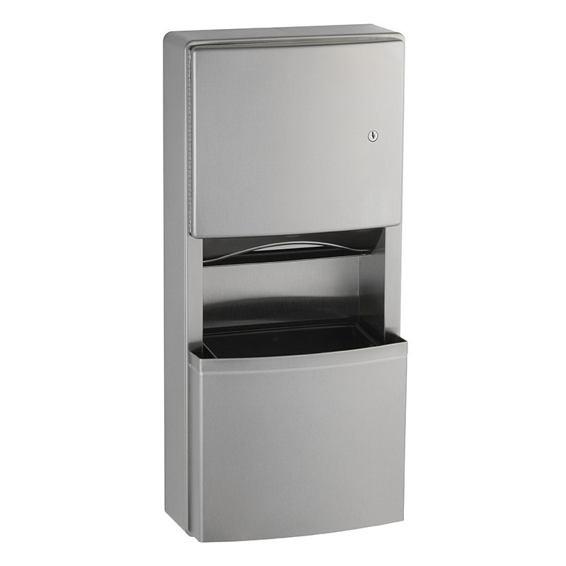 Le combiné mural en applique inox compact NOVA, composé d’un distributeur d’essuie-mains et d’une poubelle, optimise l’espace et simplifie l’aménagement des espaces sanitaires.