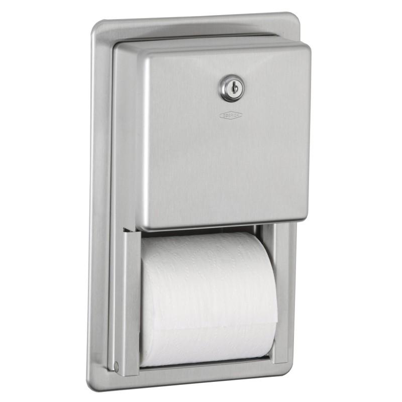 Porte-rouleaux papier domestique double encastré inox pour site exposé au vandalisme, avec rouleau de réserve.