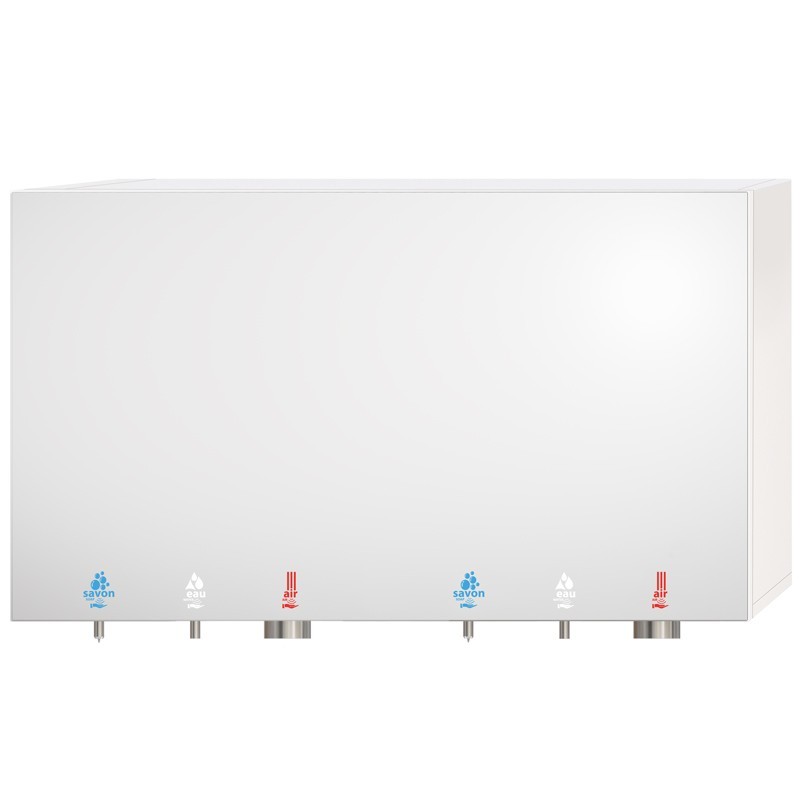 Module miroir 2 postes prêt à poser au-dessus des vasques ou lavabos comprenant les distributeurs savon automatiques liquide ou mousse, les robinets électroniques eau avec pré-mélangeur thermostatique, et les sèche-mains haute vitesse dissimulés. Ces fonctions sont activées par détection, sans contact. Pictogrammes avec leds.